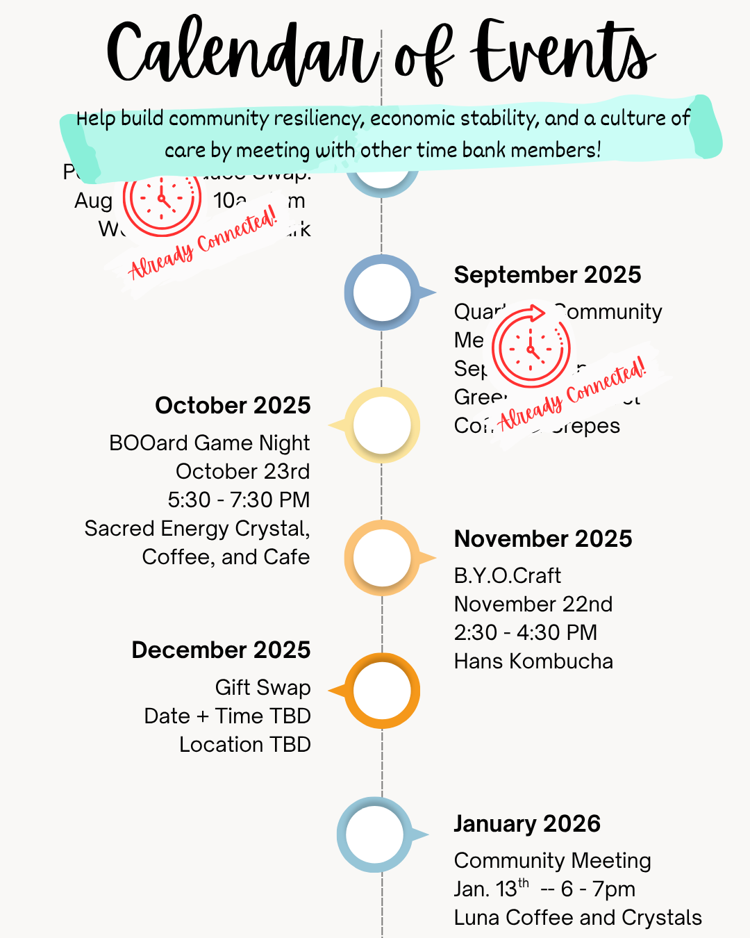 So excited to share updates from our last community meeting! We are so grateful for the time, energy, and involvement of great time bank members that help to come up with ideas for fun events!